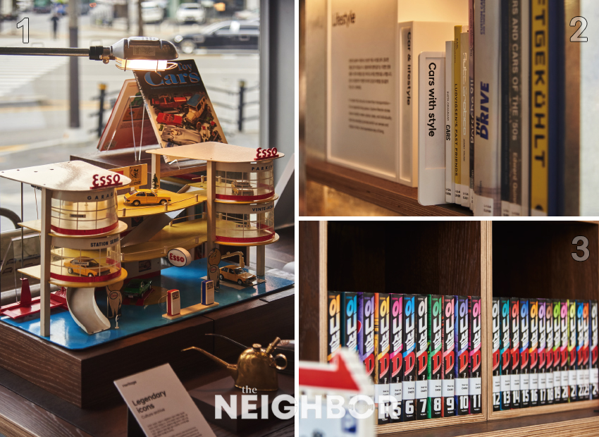 ¸ÕÀú 1Ãþ¿¡ µé¾î¼¸é ¼Á¡À̳ª ÆíÁý¼óÀÌ ¿¬»óµÇ´Â ¼°¡°¡ ÀÛÀº ¹Ì·Î °°Àº ±æÀ» ³½´Ù. Ã¥Àå¿¡´Â ÀÚµ¿Â÷ °ü·Ã īŻ·Î±×¿Í ¾ÆÆ®ºÏ, ÀâÁö, ¸¸ÈÃ¥ºÎÅÍ ÀÚµ¿Â÷¿¡¼ »¸¾î³ª°£ ¿©Çà, ¿ä¸®, µðÀÚÀÎ µîÀÇ ¶óÀÌÇÁ½ºÅ¸ÀÏ µµ¼°¡ ºÐ¾ßº°·Î ²ÈÇô ÀÖ°í, °÷°÷¿¡ ºóƼÁö ¹Ì´ÏÄ«, ·¹ÀÌ½Ì ±ÂÁî, Ä·Çοëǰ, ÀÚµ¿Â÷ ¸¸È <ÀÌ´Ï¼È D>ÀÇ ¸ðÇü µî ¼ÒÀå ¿å±¸¸¦ ºÎ¸£´Â ¾ÆÀÌÅÛÀÌ Àü½ÃµÇ¾î ÀÖ´Ù. ÀÌ´Â Ã÷Ÿ¾ß ¼Á¡À» ¿î¿µÇÏ´Â ÀϺ»ÀÇ ÄÜÅÙÃ÷ ±â¾÷ CCC(Culture Convenience Club)¿ÍÀÇ Çù¾÷À¸·Î ¿Ï¼ºµÆ´Ù. ·¹ÀÌ½Ì ¾ÆÀÌÅÛ°ú ÀÚµ¿Â÷ Æ÷½ºÅͰ¡ Áø¿µÈ 2ÃþÀº ½¬¾î °¥ ¼ö ÀÖ´Â Ä«Æä °â ¶ó¿îÁö °ø°£ÀÌ´Ù.