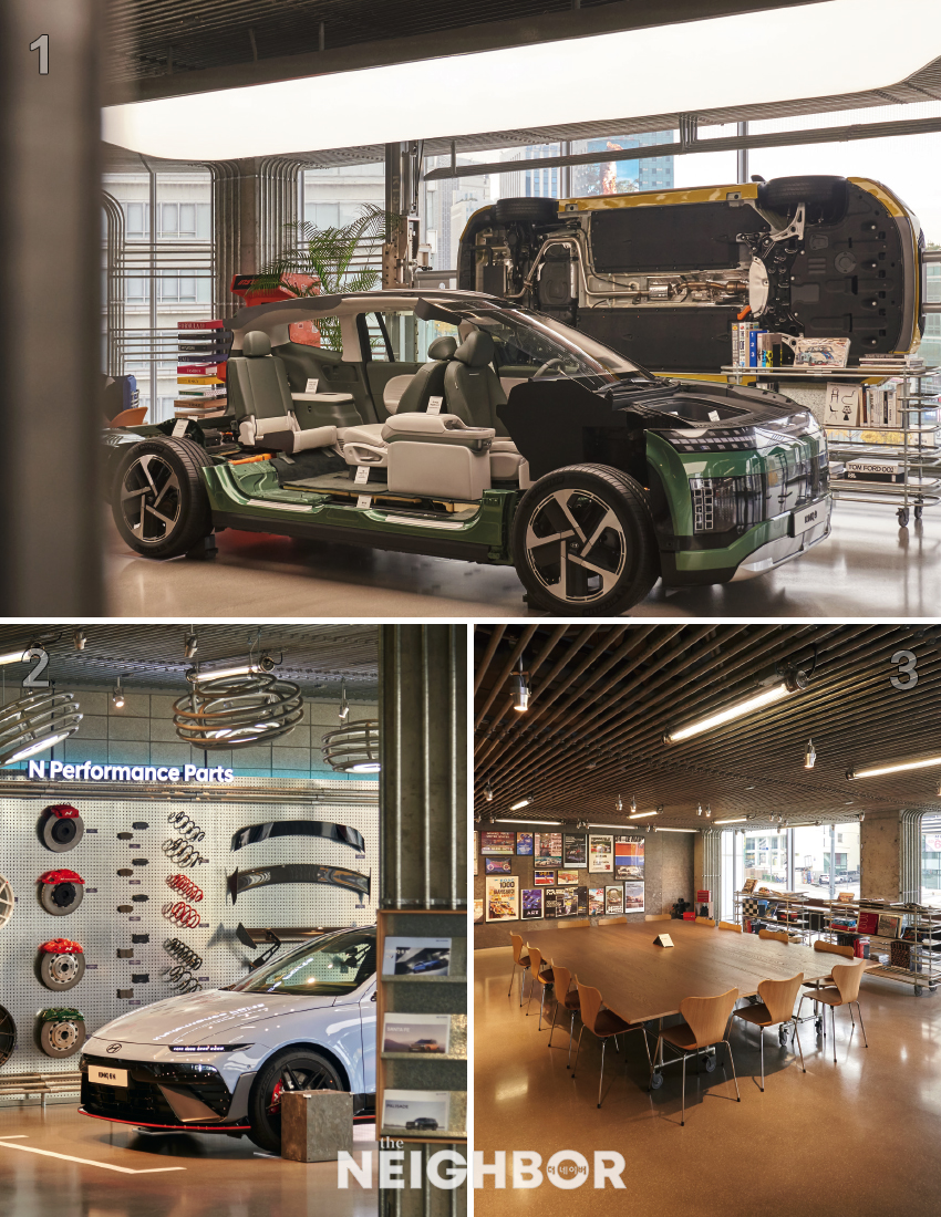 3Ãþ°ú 4ÃþÀº Â÷·® Àü½ÃÀåÀ¸·Î, 3ÃþÀº Çö´ëÀÚµ¿Â÷ÀÇ °í¼º´É ºê·£µå N, ±×¸®°í 4ÃþÀº Àü±âÂ÷ ¾ÆÀÌ¿À´Ð Àü¿ë °ø°£ÀÌ´Ù. Â÷·® Àü½Ã ½ºÆýÀÇ ±¸Á¶¹°À» ÆÄ¶õ»ö¿¡¼ ¸ÞÅ»·Î ¹Ù²Ù¾ú°í, 4Ãþ¿¡´Â ¾ÆÀÌ¿À´Ð ´ÙÀÌij½ºÆ® ¿ùÀ» Á¶¼ºÇß´Ù. ¸â¹ö½Ê Àü¿ë °ø°£ÀÎ 5Ãþ Ŭ·´ ¶ó¿îÁö¿¡¼´Â ÁÖ±âÀûÀ¸·Î Àü½Ã¸¦ °³ÃÖÇÑ´Ù. ÇöÀç´Â <CMF(Color, Material, Finish)> Àü½Ã¸¦ ÅëÇØ Çö´ëÀÚµ¿Â÷ Â÷·® µðÀÚÀÎÀÇ ½Ç¸¶¸®°¡ µÈ Ä÷¯, ¼ÒÀç, ¸¶°¨ °ü·Ã ¿ÀºêÁ¦¸¦ 2026³â ÃʱîÁö ¼Ò°³ÇÑ´Ù. ÀÏÁ¾ÀÇ »ïÂ÷¿ø ¾ÆÀ̵ð¾î º¸µå¸¦ ÅëÇØ µðÀÚÀÎÀÇ ¹ßÀü °úÁ¤À» »ìÇÊ ±âȸ´Ù.