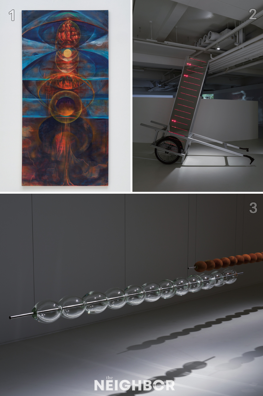1 ‘»ïü¹®Á¦’, 2024~2025, Acrylic paint, fabric ink on printed silk, wood panel, 130×263cm. 2 ‘S.O.S.-´Þ·Á¶ó ½Å½Å’ ÆÛÆ÷¸Õ½º¿¡ Ȱ¿ëµÈ ‘°Å¿ï ¿À¹ÌÄڽÒ. 3 À¯¸®·Î Á¦ÀÛÇÑ ‘µ¿ÇØ Æ÷Åͺí ŰÆÛ’¿Í Å×¶óÄÚŸ °¡·ç·Î µ¤Àº ‘¼ÇØ Æ÷Åͺí ŰÆÛ’.