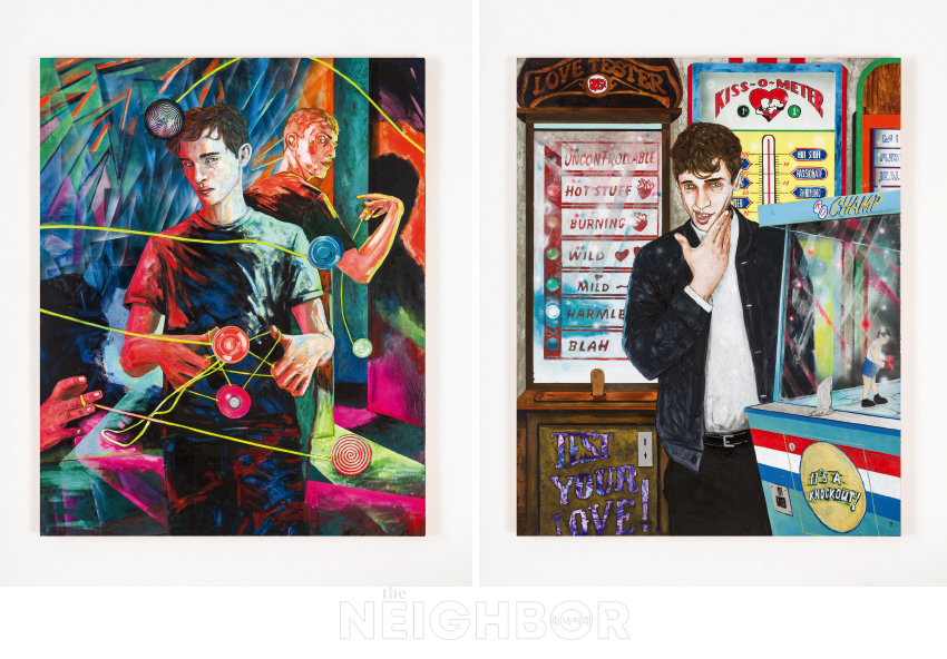 1 ‘Round one(yo-yo world championships)’, 2025, Acrylic on linen, 127×101.6cm. Courtesy the artist and Lehmann Maupin, New York, Seoul, and London. Photo by Silvia Ros. 2 ‘Taking it on the chin’, 2025, Acrylic on linen, 127×101.6cm. Courtesy the artist and Lehmann Maupin, New York, Seoul, and London. Photo by Silvia Ros.