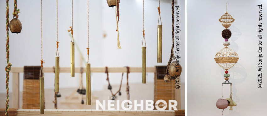 1 È«¿µÀÎ, ‘¼Òǰ 5. Â÷ÀÓº§ ±â°è’, 2025, õ¿¬ ¼¶À¯, Á¾, ³ò¼è, ¹åÁÙ, ³ª¹« ¸·´ë, ³ª¹« ±¸Á¶¹°, 2°³ÀÇ ÀÇÀÚ, ¾à 130x220x85cm. »çÁø ³²¼¿ø. Á¦°ø ¾ÆÆ®¼±Àç¼¾ÅÍ. 2 È«¿µÀÎ, ‘¼Òǰ 7. »õ°¡ µÇ¾î’, 2024, ¹öµå³ª¹«, µî³ª¹«, »ö½Ç, ±Ý¼Ó, ¼¼ °³ÀÇ µµÀÚ±â Á¾, 60x60x250cm. »çÁø ³²¼¿ø. Á¦°ø ¾ÆÆ®¼±Àç¼¾ÅÍ.