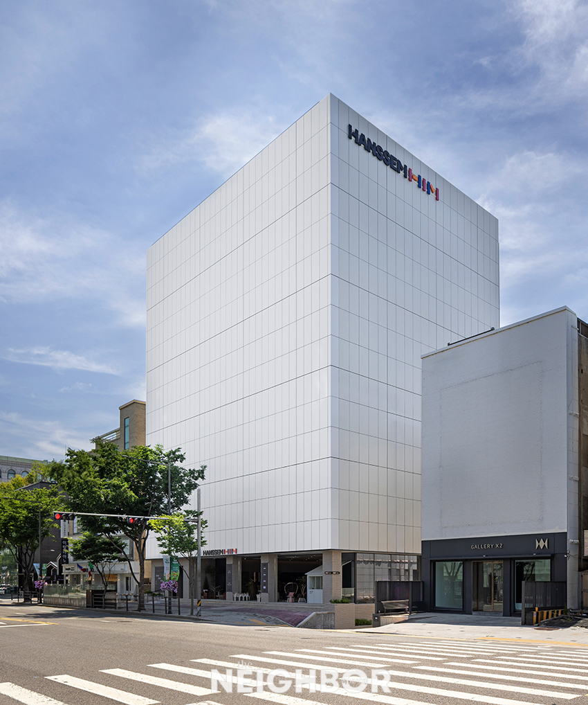 º¹ÀâÇÑ ³íÇö °¡±¸°Å¸® ÇÑ °¡¿îµ¥ »õÇÏ¾á °Ç¹° Çϳª°¡ ´«¿¡ ¶è´Ù. ÁÖº¯ °Ç¹°Ã³·³ º¹ÀâÇÑ ¹«´Ìµµ, È·ÁÇÑ °£ÆÇµµ ¾ø´Ù. ±×·¡¼ ´õ ´«¿¡ ¶ç´Â °Ç¹°ÀÌ Ç÷¡±×½Ê ³íÇöÀÌ´Ù. ÇÑ»ùÀº À̹ø ¸®´º¾óÀ» ÅëÇØ °Ç¹° ¿Ü°ü¿¡ ºû°ú ¼±, ÈÀÌÆ® Ä÷¯¸¦ µðÀÚÀÎ Æ÷ÀÎÆ®·Î »ï¾Æ ºê·£µå Á¤Ã¼¼ºÀ» Ç¥ÇöÇß´Ù. ÀÚÀç·Î Ȱ¿ëÇÑ Åõ±¤ ´ë¸®¼®Àº ½Ç³»¿¡¼ Åõ°úµÇ´Â ºûÀ» ±×´ë·Î ³ëÃâ½ÃÄÑ ¸Ö¸®¼µµ °Ç¹°À» ÇÑ´«¿¡ ¾Ë¾Æº¼ ¼ö ÀÖµµ·Ï µ½´Â´Ù. ÇÑ»ùÀÌ ÁöÄÑ ¿Â Çѱ¹Àû Ç츮ƼÁö¸¦ ´ã¾Æ³»¸é¼µµ, ¸ð´øÇÑ º¯ÈÀÇ ÀÇÁö°¡ ´À²¸Áö´Â µðÀÚÀÎÀÌ´Ù.