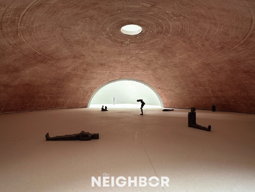 ƯÈ÷ À̹ø Àü½Ã¿¡¼´Â ¾ÈÅä´Ï °õ¸®¿Í ¼¼°èÀûÀÎ °ÇÃà°¡ ¾Èµµ Ÿ´Ù¿À(Ando Tadao)°¡ Çù¾÷ÇÑ ¹ÂÁö¾ö SANÀÇ »õ·Î¿î °ø°£ ‘GROUND’µµ ù¼±À» º¸ÀδÙ. °ÇÃà, Á¶°¢, ÀÚ¿¬ÀÌ Çϳª·Î È£ÈíÇÏ´Â ‘GROUND’´Â ÀÛǰÀÎ µ¿½Ã¿¡ Àå¼Ò·Î ±â´ÉÇϸç, ¹ÂÁö¾ö SANÀÌ ¼³¸³ ÀÌ·¡ Áö¼ÓÇØ¿Â ‘¿¹¼ú-ÀÚ¿¬-°ÇÃà’ÀÇ Á¶È¸¦ »ó¡ÀûÀ¸·Î º¸¿©ÁÖ´Â ½ÇÇèÀû °ø°£ÀÌ´Ù. ³»ºÎ Á÷°æ 25m, õ°í 7.2m, Á÷°æ 2.4mÀÇ ¿øÇü õâÀ» °®Ãá µ¼ ÇüÅÂÀÇ °ø°£Àº ¹ÂÁö¾ö SANÀÇ Çöó¿ö °¡µç ¾Æ·¡¿¡ Á¶¼ºµÇ¾ú´Ù. ºûÀÌ ¿øÇü õâÀ¸·Î À¯ÀԵǴ ‘GROUND’´Â ÀÌÅ»¸®¾Æ ·Î¸¶ ÆÇÅ׿ÂÀÇ ¾à 4ºÐÀÇ 3 ±Ô¸ð¿¡ ÇØ´çÇÏ´Â ¿õÀåÇÔÀ» ÀÚ¶ûÇÑ´Ù.