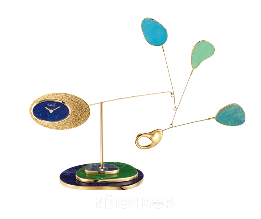 ¹®È °Ýº¯±âÀÎ 1960³â´ë, ÇǾÆÁ¦´Â ½Ã´ë È帧¿¡¼ ¿µ°¨ ¹Þ¾Æ ÇüŸ¦ ÀÚÀ¯ÀÚÀç·Î ¹Ù²Ù´Â ½Ã°è¿Í Á־󸮸¦ ºú¾î³Â´Ù. ±× âÀǼºÀº ÇǾÆÁ¦ÀÇ »õ·Î¿î ÀÛǰÀΠŰ³×ƽ ¾ÆÆ® ÇüÅÂÀÇ ÇÏÀÌ ÁÖ¾ó¸® ¸ðºô ‘¿£µå¸®½º ¸ð¼Ç’¿¡¼ ²÷ÀÓ¾ø´Â ¿òÁ÷ÀÓÀ¸·Î ±¸ÇöµÈ´Ù. ÇÁ¶û½º Ãâ½Å Á¶°¢°¡ ¾Ë·º½º ÆÈ·»½ºÅ°(Alex Palenski)¿ÍÀÇ Çù¾÷À¸·Î ź»ýÇÑ Á¶°¢ ÀÛǰ ¸ðºôÀº À¯Èñ¼º°ú Á¤±³ÇÔ, ´ë´ãÇÔÀÌ Á¶È¸¦ ÀÌ·ç¸ç ¿ÃÇØ ÇÏÀÌ ÁÖ¾ó¸® Ä÷º¼ÇÀÇ Å׸¶ ‘¼ÎÀÌÇÁ ¿Àºê ¿¢½ºÆ®¶ó·¹°£ÀÚ(Shapes of Extraleganza)’¿Íµµ ÀÚ¿¬½º·´°Ô ¸Â´ê´Â´Ù. ÀÛǰÀÇ Á߽ɿ¡ ÀÚ¸®ÇÑ ºí·¢ ¿ÀÆÈ ´ÙÀ̾óÀº ‘ÇǾÆÁ¦°¡ ¹Ù¶óº¸´Â ¼¼»óÀº ¸¶Ä¡ ´Ù¾çÇÑ ÃëÇâ°ú °¨¼ºÀ» Áö´Ñ ¿ÀÆÈ°úµµ °°´Ù’´Â À̺ê ÇǾÆÁ¦ÀÇ Ã¶ÇÐÀ» ¶°¿À¸£°Ô ÇÑ´Ù. ÄõÃ÷ ¹«ºê¸ÕÆ®·Î ±¸µ¿ÇÏ´Â °ñµå ÇÚÁî ¾Æ·¡, °¢±â ´Ù¸¥ »öä¿Í Åõ¸íµµ¸¦ Áö´Ñ ¿ÀÆÈÀÌ ºû³ª°í ¸ðµç ÀÛǰÀº ¼¼»ó¿¡ Çϳª»ÓÀÎ Á¸Àç°¡ µÈ´Ù. ÇǾÆÁ¦ÀÇ ½Ã±×³Êó ¼¼°ø ±â¹ýÀÎ µ¥ÄÚ ÆÓ¸®½º·Î ¿Ï¼ºÇÑ °ñµå ÄÉÀ̽º°¡ ´ÙÀ̾óÀ» °¨½Ñ ä ¸ðºôÀÌ ¿òÁ÷ÀÏ ¶§¸¶´Ù ´«ºÎ½Ã°í ¸ÅȤÀûÀÎ È¿°ú¸¦ ¼±»çÇÑ´Ù. °ñµå ½Ã°è´Â À¯±âÀûÀÎ ÇüÅ·Π¼¼°øµÈ ¿À³Ê¸ÕÆ® ½ºÅæ°ú ¿Ïº®ÇÏ°Ô ¾î¿ì·¯Áö¸ç ÀÚ¿¬°úÀÇ ±³°¨À» º¸¿©ÁØ´Ù. ÇüŰ¡ Á¶±Ý¸¸ º¯Çصµ ¸ðºôÀÇ ¿òÁ÷ÀÓÀÌ ´Þ¶óÁö´Â ¸¸Å, ÀÛǰÀÇ ±ÕÇüÀ» À¯ÁöÇÏ´Â ÀÏÀº Àý´ë ½±Áö ¾ÊÀº µµÀüÀ̾ú´Ù. ±â¼ú°ú ¹ÌÇÐ »çÀÌ¿¡¼ ¿Ïº®ÇÑ ±ÕÇüÀ» ÀÌ·ç´Â °Í, Á¤±³ÇÑ ¿öÄ¡¸ÞÀÌÅ·°ú ÇÏÀÌ ÁÖ¾ó·¯ °¨°¢À» °âºñÇÑ ÇǾÆÁ¦¸¸ÀÇ ¿À·£ ³ëÇϿ찡 °í½º¶õÈ÷ µå·¯³´Ù.