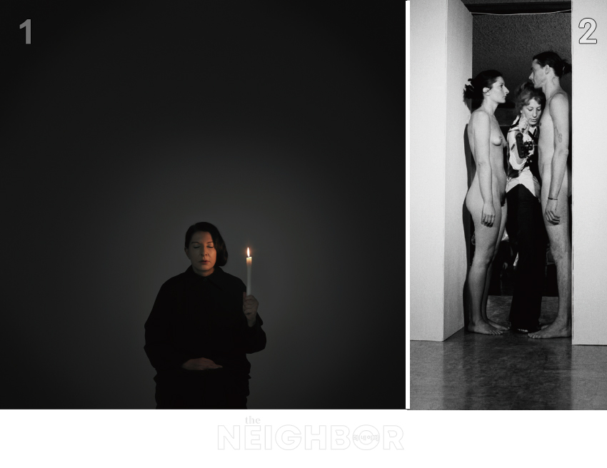 1 Marina Abramović, ‘Artist Portrait with a Candle (A)’, 2012, Fine art pigment print. Courtesy of the Marina Abramović Archives, and Galerie Krinzinger. ©Courtesy of the Marina Abramović Archives / Bildrecht, Vienna 2025. 2 Ulay / Marina Abramović, ‘Imponderabilia’, 1977, Performance, 90 minutes, Galleria Comunale d’Arte, Moderna, Bologna. Courtesy of the Marina Abramović Archives. ©Ulay/Marina Abramović. Courtesy of the Marina Abramović Archives / Bildrecht, Vienna 2025, Photo: Giovanna dal Magro.