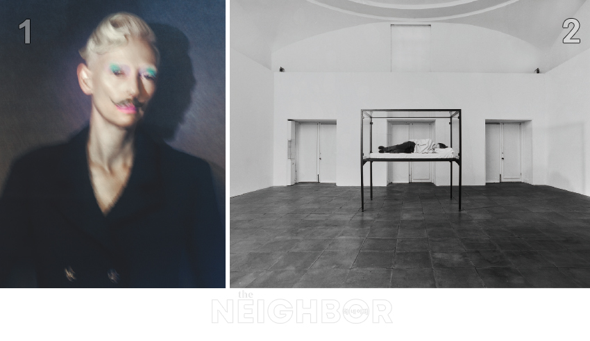 1 Tilda Swinton photographed by Casper Sejersen, 2023. ©Casper Sejersen. 2 Tilda Swinton performing ‘The Maybe’, Serpentine Gallery, London, 1995. Photo: ©Hugo Glendinning.