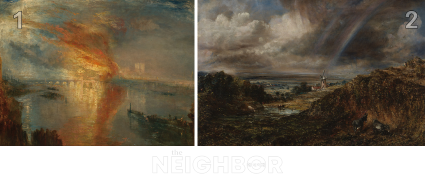 1 JMW Turner, ‘The Burning of the Houses of Lords and Commons’, 16 October 1834, 1835. Cleveland Museum of Art. Bequest of John L. Severance 1942.647. 2 John Constable, ‘Hampstead Heath with a Rainbow’, 1836. Image courtesy of Tate.