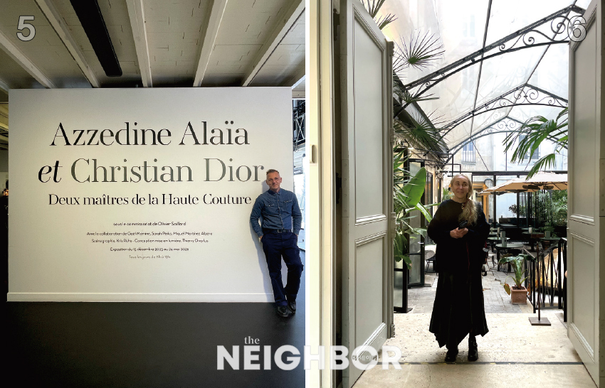5 Olivier Saillard, leaning against the exhibition title wall. 6 Carla Sozzani smiling at the entrance of the exhibition Photo: Courtesy of iabyia.