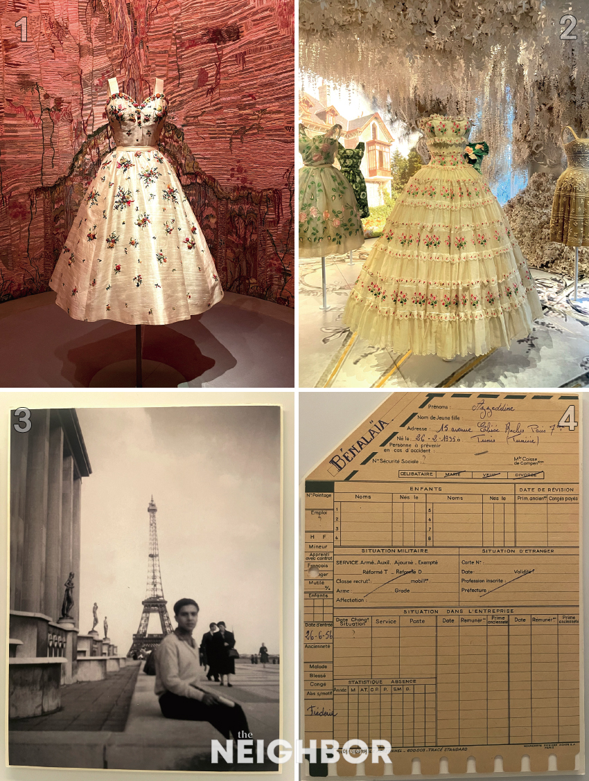 1 <Octave Feuillet>, Christian Dior Haute Couture printemps-été 1952. 2 <fête au village>, Christian Dior Haute Couture printemps-été 1955. 3 Azzedine Alaïa in Paris,1956 Photo : Courtesy of iabyia(1, 2, 3). 4 Employee sheet for Azzedine BeénalaÏa.