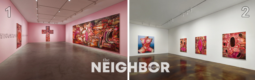 1 ÀåÆÄ, ‘Gore Deco–Emily’, 2025, Oil on linen, 162.2×130.3cm. Courtesy of the artist and Kukje Gallery. »çÁø ¾Èõȣ, ±¹Á¦°¶·¯¸® Á¦°ø. 2 ÀåÆÄ, ‘Gore Deco–Oh, Those Breasts’, 2025, Oil, oil pastel, gauze, jute, human hair, transfer print on linen, 162.2×130.3cm. Courtesy of the artist and Kukje Gallery. »çÁø ¾Èõȣ, ±¹Á¦°¶·¯¸® Á¦°ø.