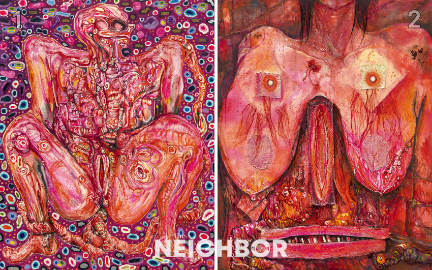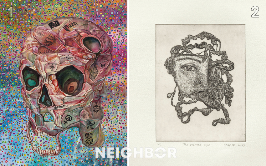 1 ÀåÆÄ, ‘Gore Deco–Stupidity’, 2025, Oil, oil pastel, silkscreen, transfer print on linen, 145.5×112.1cm. Courtesy of the artist and Kukje Gallery. »çÁø ¾Èõȣ, ±¹Á¦°¶·¯¸® Á¦°ø. 2 ÀåÆÄ, ‘The Visceral Eye’, 2025, Etching on Hahnemühle paper, 19.8×15.2cm. »çÁø ¾Èõȣ, ±¹Á¦°¶·¯¸® Á¦°ø.