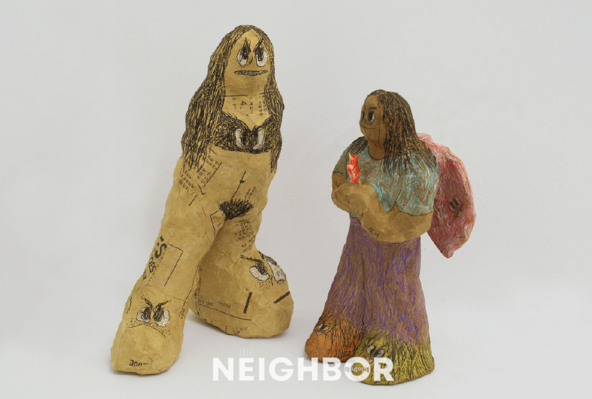1 ½Å¹Î, ‘Young Joo’, ‘Hee Jung’, 2026, Oil based clay, McDonalds French fries sacks, pencil, 28×20×15cm, 25×14×11cm. P21 Á¦°ø.