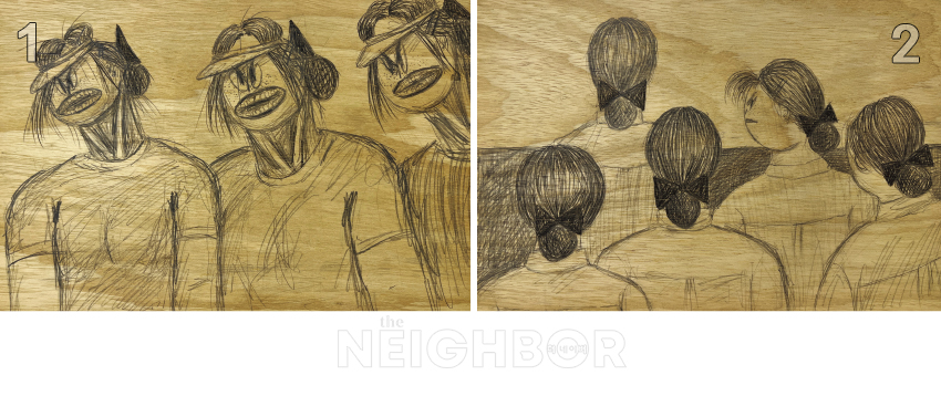 1 ½Å¹Î, ‘á¦Ú¸(semi)- ȯ¿µÇմϴپƾƾÆ!!!!’, 2019, Pencil on wood, 16×20cm. P21 Á¦°ø. 2 ½Å¹Î, ‘á¦Ú¸(semi)-¼ºñ½º Çï°ÔÀÌÆ® ÀÔÀå’, 2019, Pencil on wood, 16×20cm. P21 Á¦°ø.