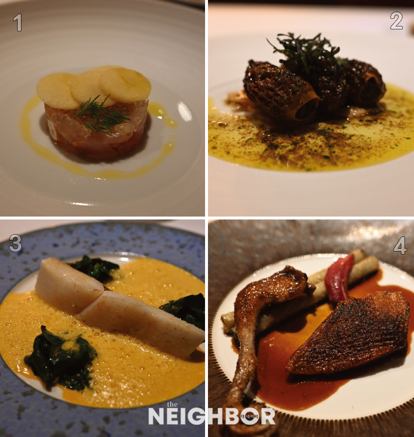 ±× °·ÄÇß´ø ±â¾ïÀ» ¾È°í ´Ù½Ã ãÀº ¶ó»Ç¶ß´Â ¿©ÀüÈ÷ Â÷ºÐÇß´Ù. ²Ù¹Ò¾øÀÌ ´ÜÁ¤ÇÑ ÀÎÅ׸®¾î´Â À̰÷ÀÇ ¿ä¸®°¡ ÁöÇâÇÏ´Â ¹Ù¿Í ²À ´à¾Æ ÀÖ¾ú´Ù. ¾Æ¹¿Áî ºÎ½´·Î ³ª¿Â ±¸Á¦¸£(Gougère)´Â ÇÁ¶û½º½Ä Ä¡Áî ½´ÀÇ Á¤¼®À» º¸¿©ÁÖ¾ú´Ù. °ÑÀº ±âºÐ ÁÁ°Ô ¹Ù»èÇϰí, ¼ÓÀº Æø½ÅÇÏ´Ù. ¾ÃÀ»¼ö·Ï ÀԾȿ¡ ÆÛÁö´Â µû¶æÇÑ °ø±â°¨°ú ÃËÃËÇÔ, ±×¸®°í µÚÀ̾î ã¾Æ¿À´Â Ä¡ÁîÀÇ Â¬Â©ÇÑ ¿©¿îÀº ÈÀÌÆ® ¿ÍÀΰú ¿Ïº®ÇÑ ÇÕÀ» ÀÌ·ç¾ú´Ù. ÇÔ²² µîÀåÇÑ º¼·Î¹æ(Vol-au-vent)Àº ¶ø½ºÅͰ¡ ¿Ã¶ó°£ ÀÛÀº ÆäÀ̽ºÆ®¸®·Î, ÃþÃþÀÌ ºÎÇ®¾î ¿À¸¥ ÆÄ»èÇÑ ½Ä°¨ »çÀÌ·Î ¹öÅÍ Ç³¹Ì°¡ ÁøÇÏ°Ô ÇÇ¾î ¿À¸¥´Ù. ¶ø½ºÅÍÀÇ ´Ü¸À°ú ¾ÆÀ̿ø® ¼Ò½ºÀÇ °í¼ÒÇÔ, ±×¸®°í µô(Dill)ÀÌ ¼±»çÇÏ´Â Çâ±ßÇÑ ³»À½ÀÌ ¹Ì°¢À» ±ò²ûÇÏ°Ô Á¤¸®ÇØÁØ´Ù. ¾Ë·© µÚÄ«½ºÀÇ Á¶¸®¹ýÀ¸·Î ¼ÕÁúµÈ ¿¡½ºÄ«¸£°í´Â Â̱êÇ쵂 °áÄÚ Áú±âÁö ¾Ê¾Ò´Ù. ¸¶´Ã°ú Çãºê ÇâÀ» ¸Ó±ÝÀº ¹öÅÍ ¼Ò½º°¡ Ãʸ®Á¶, ¼£·Ô°ú ¾î¿ì·¯Áö¸ç Æø¹ßÀûÀÎ °¨Ä¥¸ÀÀ» ¼±»çÇß´Ù. µÚÀÌ¾î ³ª¿Â ¼Ò »Ê»ì Äá¼Ò¸Þ´Â Àγ»ÀÇ ¹ÌÇÐÀ» º¸¿©Áִµ¥, °í±â¿Í »À, Çâ並 Àå½Ã°£ ¹¶±ÙÈ÷ ²ú¿© ºÒ¼ø¹°À» °È¾î³½ À¯¸®¾Ëó·³ ¸¼Àº À°¼ö´Â ³óÃàµÈ dz¹Ì°¡ ¾ÐµµÀûÀ̾ú´Ù. Äݶó°ÕÀÌ ³ì¾Æµé¾î Á©¸®Ã³·³ ºÎµå·¯¿öÁø »Ê»ì°ú ¶ß°Å¿î ±¹¹°ÀÇ À° Çâ, ¿©±â¿¡ Æ®·¯ÇÃÀÌ ´õÇØÁö¸ç ¹Ðµµ ³ôÀº ¸ÀÀÇ ÃþÀ§¸¦ ¿Ï¼ºÇϰí ÀÖ¾ú´Ù. ¶ø½ºÅÍ´Â Á¤È®ÇÑ Àú¿Â Á¶¸®¿Í ¹öÅÍ Æ÷ĪÀ» ÅëÇØ ÅʱÛÅʱÛÇÑ Åº·ÂÀ» ÀÒÁö ¾Ê¾Ò°í, ¸Ó¸®¿Í ³»ÀåÀ» ºº´Ù°¡ Äڳſ¡ Çö÷º£Çؼ ¸¸µç Áê(Jus)´Â £°í ¸¼Àº Áú°¨À¸·Î ÀԾȿ¡ ±ä ¿©¿îÀ» ³²°å´Ù.