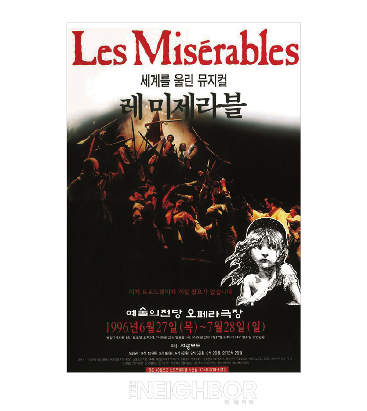 ¼¼°è 4´ë ¹ÂÁöÄà Áß ÇϳªÀÎ <·¹¹ÌÁ¦¶óºí>ÀÌ ±¹³»¿¡¼ ù ¹«´ë¸¦ °¡Á³´Ù. ºòÅ丣 À§°íÀÇ ¼Ò¼³ <·¹ ¹ÌÁ¦¶óºí>ÀÌ ¿øÀÛÀÎ ÀÌ ¹ÂÁöÄÃÀº 1980³â ÇÁ¶û½º ÆÄ¸®¿¡¼ óÀ½ °ø¿¬µÆ°í, 3°³¿ù°£ 50¸¸ ¸íÀÇ °ü°´ÀÌ Ã£´Â ¼º°øÀ» °Åµ×´Ù. ÀÌÈÄ ¿µ±¹ÀÇ ¹ÂÁöÄà ÇÁ·Îµà¼ ij¸Ó·± ¸ÅŲÅä½ÃÀÇ ÇÁ·Îµà½Ì, ·Î¿ ¼ÎÀͽºÇÇ¾î ±Ø´ÜÀÇ ¿¹¼ú°¨µ¶ Æ®·¹À̹ö ³ÍÀÇ ¿¬ÃâÀ» ÅëÇØ ´ëÇü ¹ÂÁöÄ÷ΠÀçź»ýÇß´Ù. <·¹¹ÌÁ¦¶óºí>ÀÇ ºê·Îµå¿þÀÌ ¿À¸®Áö³ÎÆÀÀº 1996³â 6¿ù 27ÀϺÎÅÍ 7¿ù 28ÀϱîÁö ÇÑ ´Þ°£ ¿¹¼úÀÇÀü´ç ¿ÀÆä¶ó±ØÀå ¹«´ë¿¡ ¿Ã¶ó ¿Ï¼ºµµ ³ôÀº ¹«´ë¸¦ ¼±º¸¿© °ü°´°ú Æò´ÜÀÇ ¶ß°Å¿î ÁöÁö¸¦ ¹Þ¾Ò´Ù.